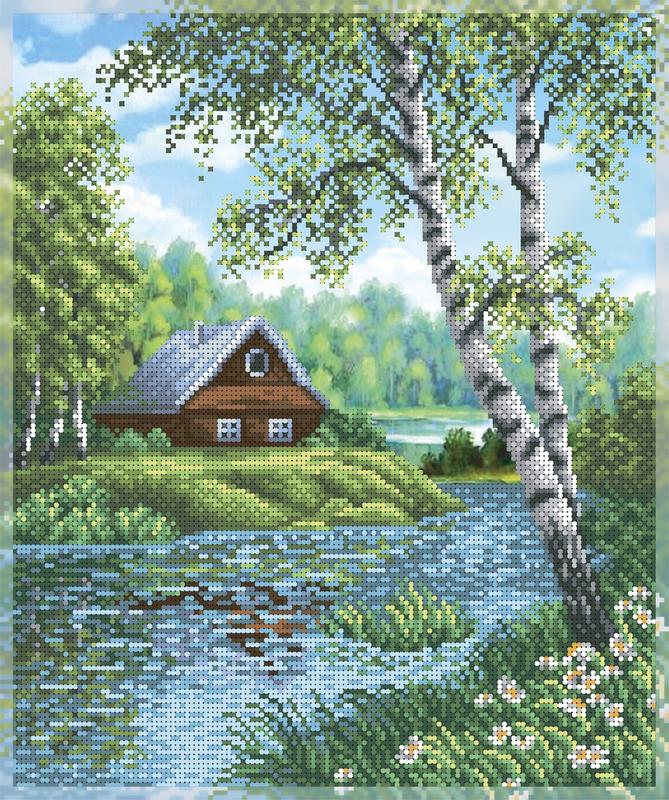 Набір для вишивки бісером "будинок біля річки" квіти, будиночки, береза, пейзаж, струмок,...