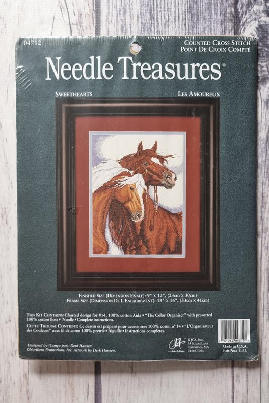 Набір для вишивки хрестом Needle Treasures 04712 Пара коней Артикул: JCA-04712 Техніка: лічильний хрест Розмір: 23 х 30 см У складі набору: канва Aida #14 бежевого кольору, муліне бавовна (розібрані за кольорами та закріплені на органайзері), голка, схема.