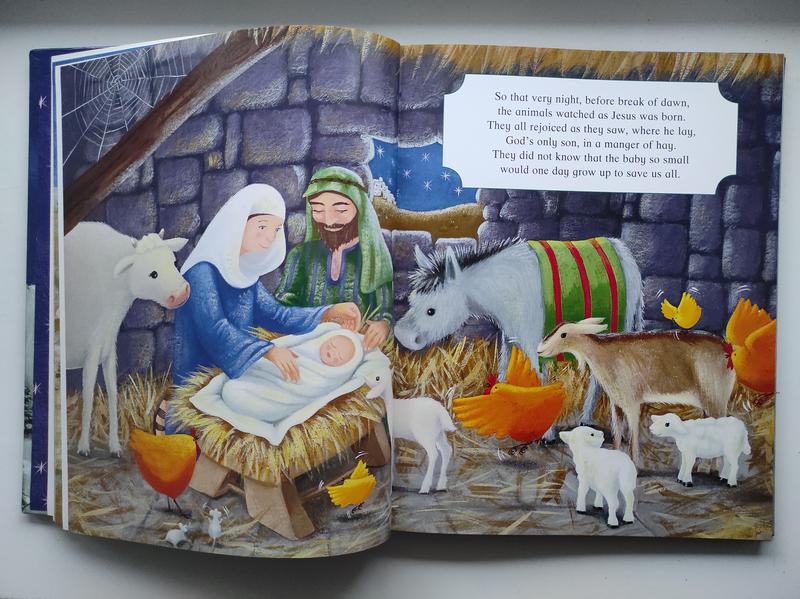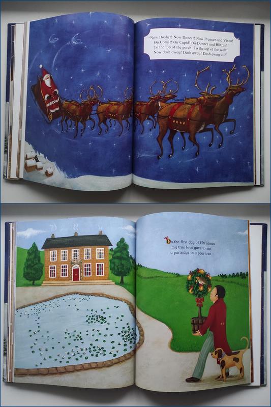 В обложку встроены маленькие лампочки, при нажатии на звезду под копытами оленей - зажигаются звёзды на небе.