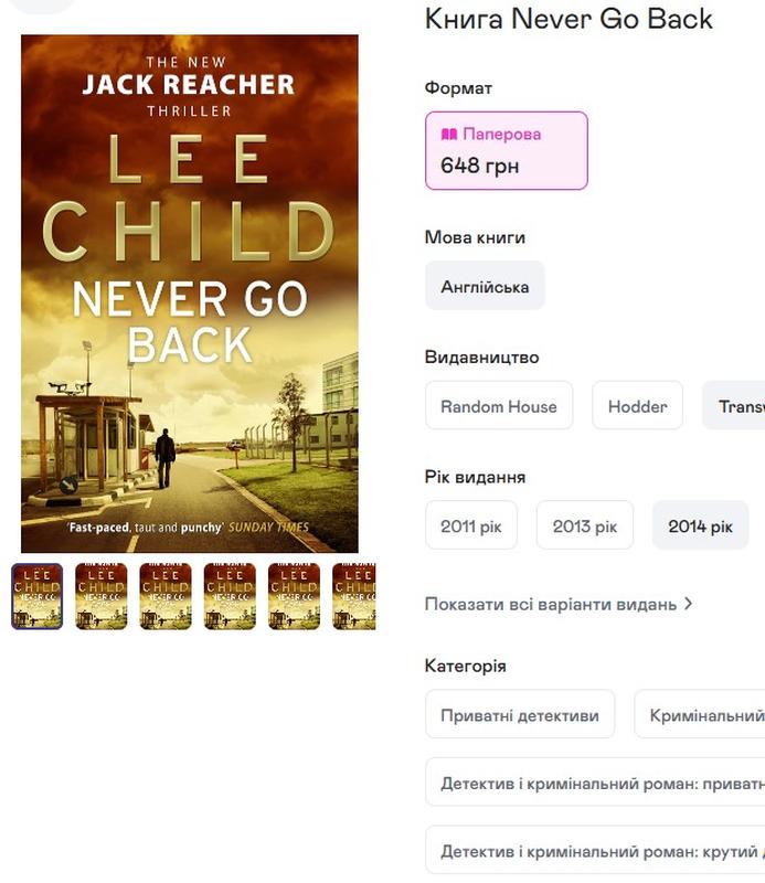 Книга англійською мовою "Jack Reacher : Never Go Back" Lee Child