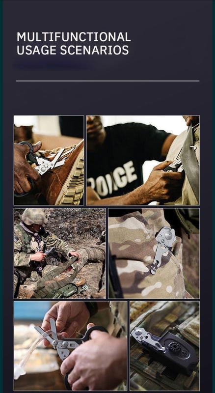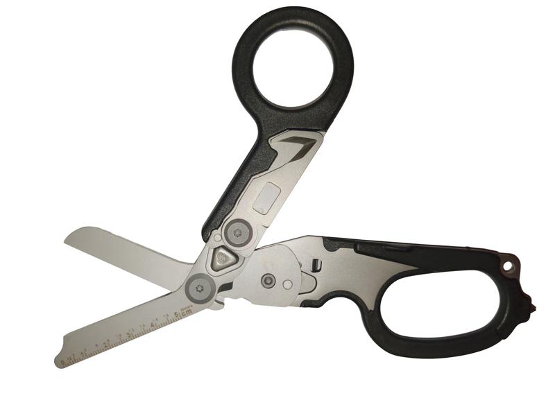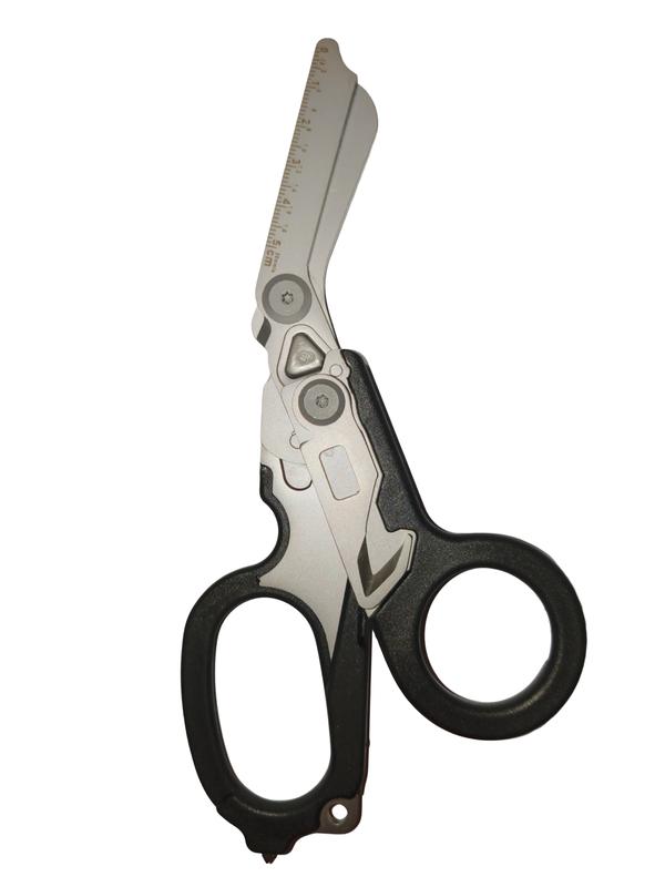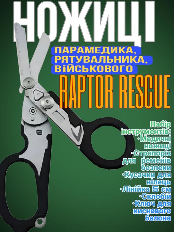 Універсальний мультиінструмент ножиці Raptor Rescue. Концепція мультитула розроблялася за участю широкого кола фахівців – парамедиків, військових, рятувальників та включає наявність базового набору інструментів, необхідних у критичній ситуації. Головний інструмент – медичні вигнуті ножиці для одягу. Завдяки товстому металу та особливої конструкції вони можуть різати навіть металеву фурнітуру гірських черевиків, що необхідно при важких травмах, коли зняти взуття та одяг можна, тільки розрізавши їх. Крім ножиць, Raptor оснастили стропорізом (виконує роль різака ременів безпеки), склобоєм із твердого сплаву для аварійного розбиття вікон, кусачками для розрізання кілець на пальцях та ключем для кисневого балона. Весь цей набір у складеному стані займає трохи більше пачки цигарок. Інструмент оснащений кліпсою для кріплення на пояс. Товар радує високою якістю виконання та чіткою механікою.