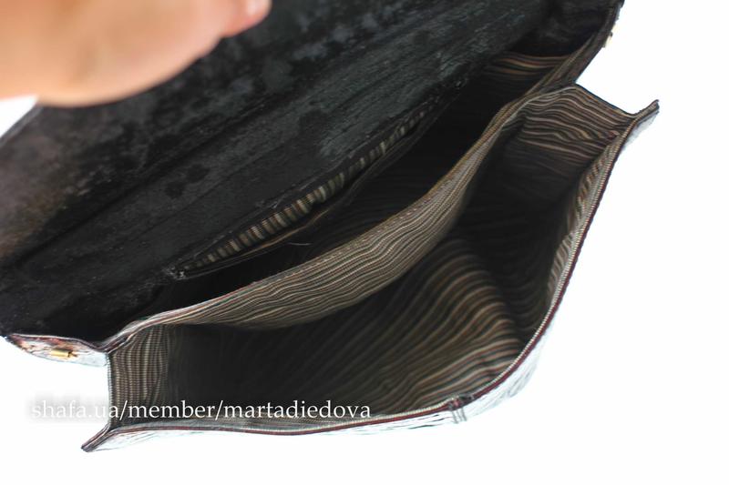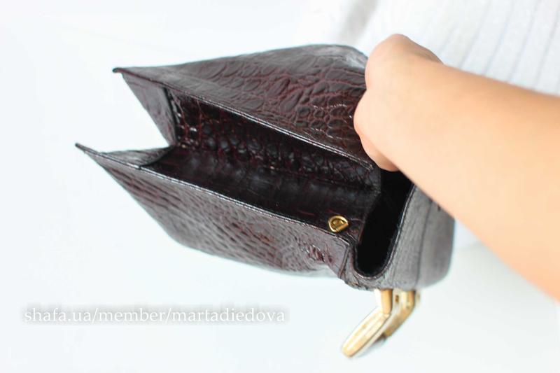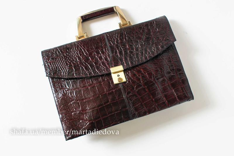 Кожа крокодила настоящая, фурнитура очень качественная, золотистая, не темнеет, без потертостей и т.п. Можно пристегнуть длинную цепочку и носить как сумку, можно носить мужчине как портфель на документы. Из нюансов только потертости на внутренней стороне подкладки верхней части. Внутри подкладка тканевая целая, замки работают.
