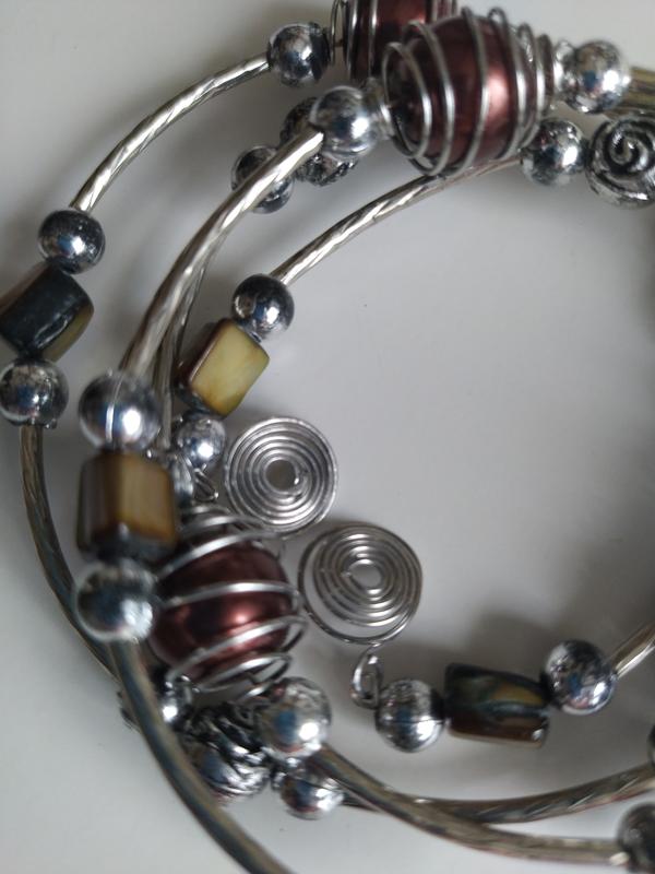 браслет з металу , з намистин натурального перламутр та металевих намистин .Зручний у використанні на будь який об'єм руки