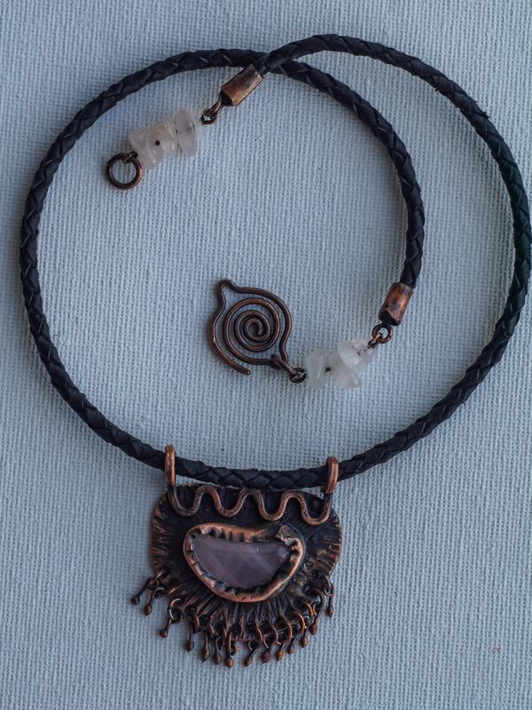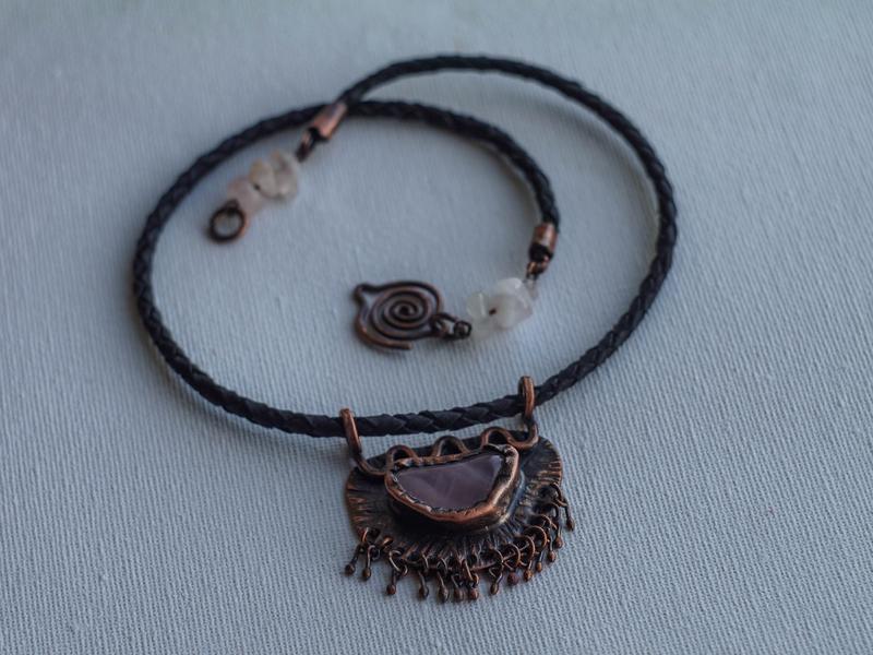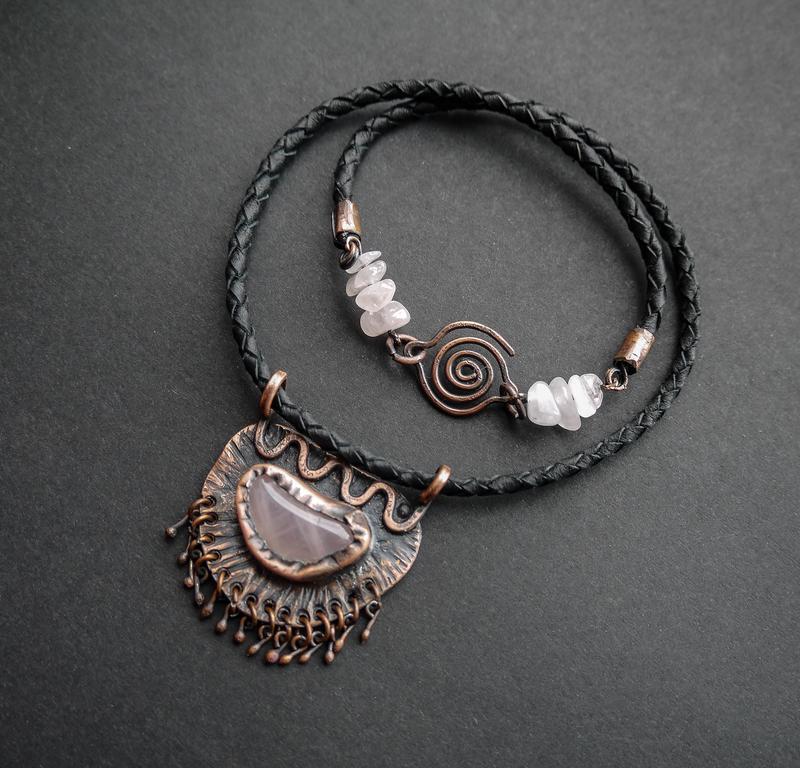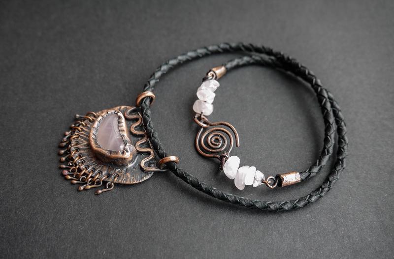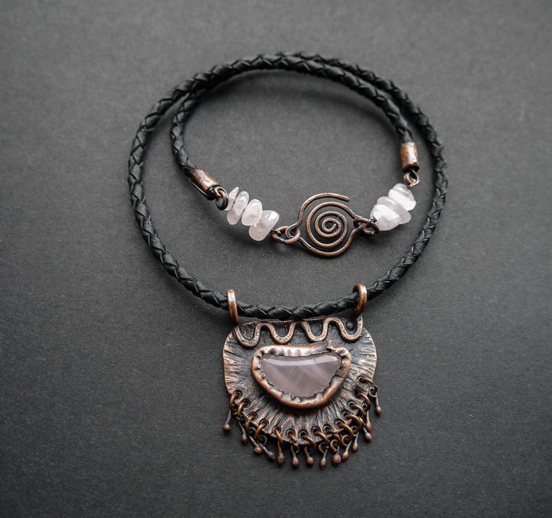 Кулон ручної роботи з міді і рожевого кварцу. Розмір кулона 3.8х3 см, кулон на шкіряній мотузці з кованої застібкою з міді, длмнна шнура з застібкою (окружність) 45 див. Про камені:Рожевий кварц символізує любов, красу, ніжність і душевну рівновагу. Він оберігає сімейне щастя і незамінний в любові. Вважається, що рожевий кварц допомагає незаміжнім жінкам вдало вийти заміж. Рожевий кварц допомагає боротися зі стресами, знімає емоційне напруження, гасить спалахи гніву, налаштовує серце на добро й любов. Він приглушує біль старих емоційних і сердечних ран. Розовый кварц повышает самооценку и чувство уверенности в себе, улучшает взаимопонимание между людьми. Этот камень дает жизненную силу своему владельцу, способствует развитию чувственности, увеличивает творческие способности.
