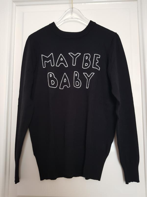 Чорний трикотажний джемпер з вишитим білим написом Maybe Baby від британського бренду Joanie Демократичний аналог люксових джемперів Белли Фройд (Ginsberg is God, 1970) - ексцентрична британська класика)) Ціновий діапазон джемперів Joanie - 45-65£ Склад - віскоза/поліамід. Добре тягнеться, тканина дуже приємна на дотик, на не дуже холодну погоду Розмір UK S , добре сідає на М, і можливо на невеликий L Стан - ідеальній, не розтягнутий, не покашлачений