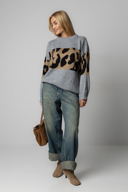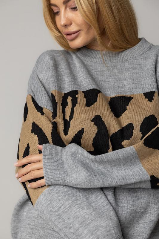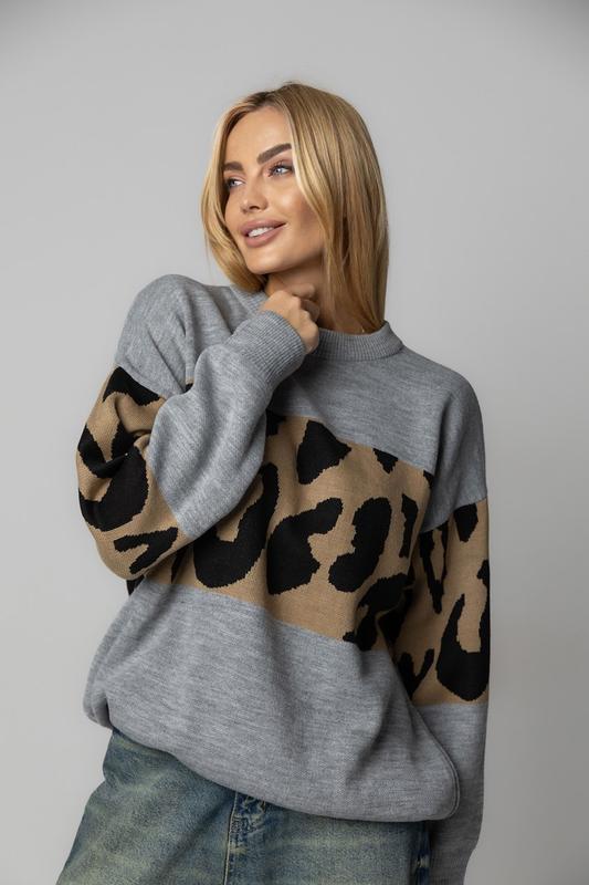 Головна деталь твоїх стильних осінніх луків - модний джемпер з машинної в'язки, прикрашений по центру кольоровим леопардовим малюнком. Такий верх ідеально доповнить і класичні штани, і трендові джинси.