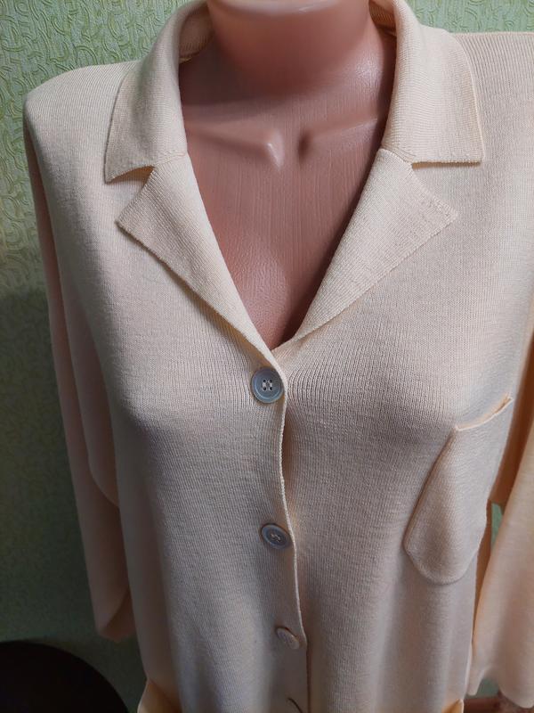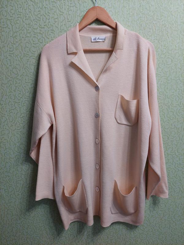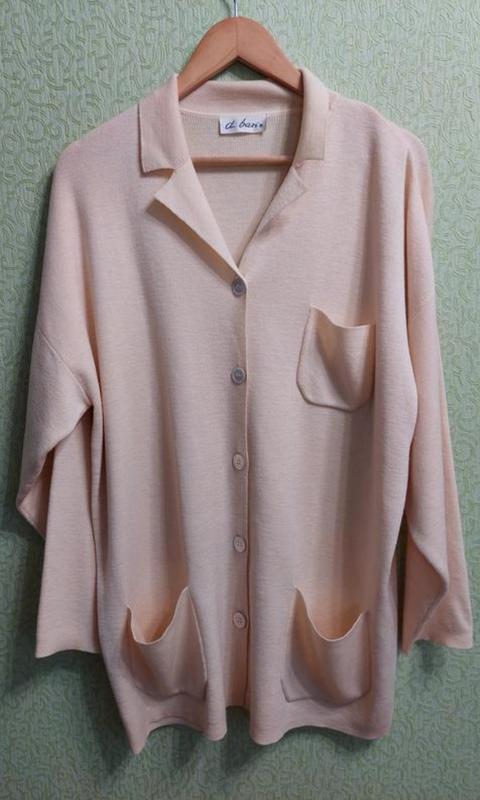 стильный кардиган кремового кольору із 100% високоякісної вержинської вовни, в'язаний простою щільною в'язкою , добре тримає форму, модель вільного крою оверсайз , з накладними кишенями, застібається на крупні ґудзики, глибока пройма і широкий рукав без манжета, ліні плечей приспущена 67, груди ПО 63, стегна 63, довжина 82, рукав від горловини( разом з плечем) 75, вказаний розмір 40, підійде як оверсайз на Л,ХЛ і навіть 2ХЛ орієнтуватися по замірах.