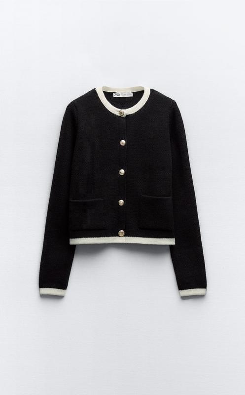 Жакет із контрастною окантовкою, круглим коміром і довгими рукавами. Застібається на рельєфні металеві ґудзики спереду