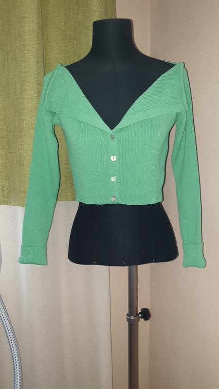 Вязаный кардиган в рубчик с вырезом на плечах, пуговицами спереди и укороченным приталенным силуэтом.