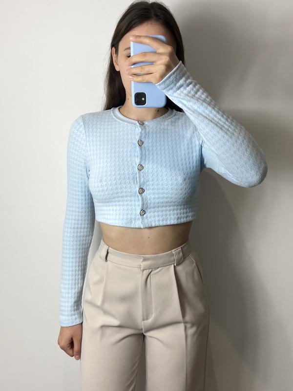 Мʼякий ніжно-блакитний топ з довгим рукавом на ґудзиках сердечках у візерунок