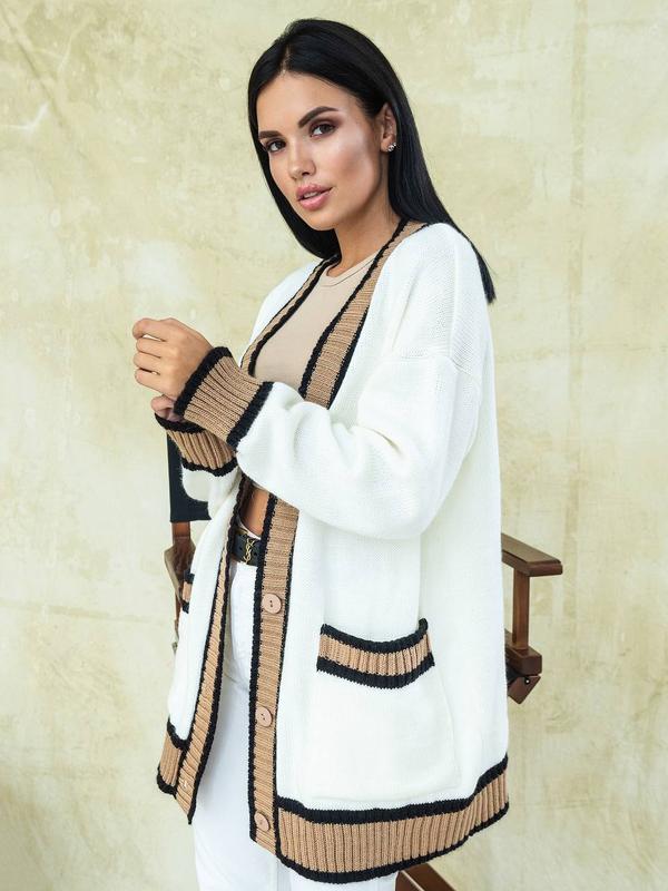 В'язаний кардиган з напівшерсті на гудзиках з кишенями ▪️Склад: 50% акрил 50% Вовна ▪️Кольори: Бежевий, чорний Джинс-кэмэл Молоко-кэмэл Рожевий-сірий ▪️Розмір : 42-46
