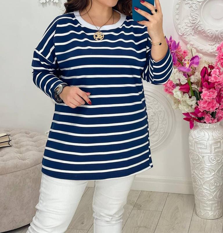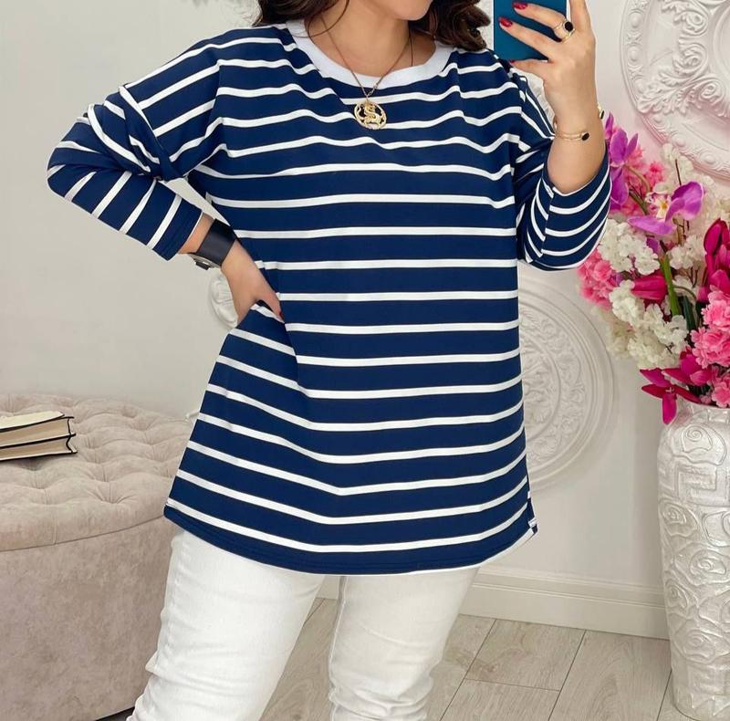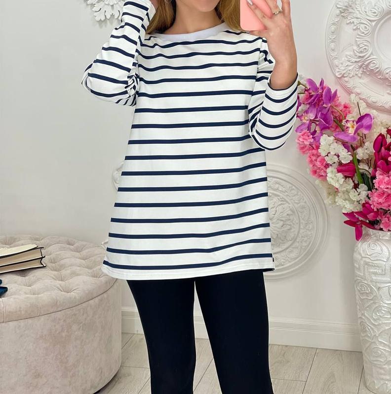 Вільний світерок в трендову смужку-морячку, на горловині біла рибана на двух кольорах, довгий, приспущений рукав, низ лонгзлива вільний.