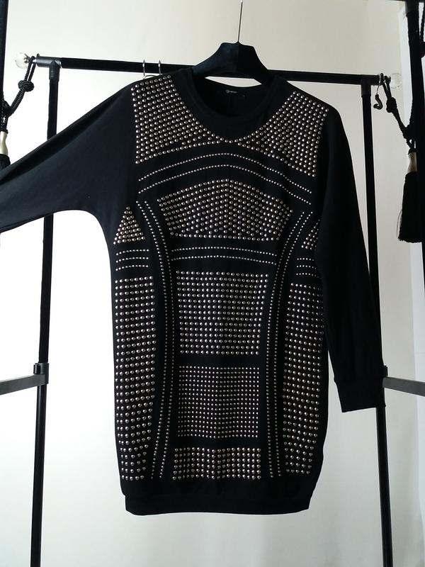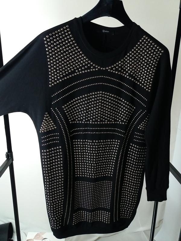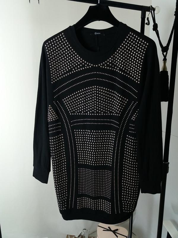 у стилі balmain модне плаття кофта від італійського бренду Relich,що користується високою популярністю не тільки в Італії,а й у всьому світі рукав реглан фасон-до низу трохи призавужений(в обтяжку) насичено-чорний з металевими високими об'єднання ємними важкуватими бульки,не вдальсь сфотографувати їх з боку(не фокусує) тримаються дуже міцно,всі на місці тканина трикотаж з еластаном високої якості,не тонка з заду на спинці брендована металева лейба Виглядає ця річ-ВАУ!!!