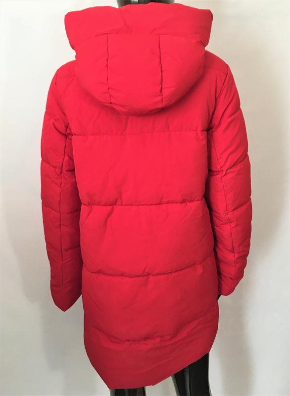Жіноча подовжена зимова куртка в червоному кольорі. Модель пряма, тепла. Зовні