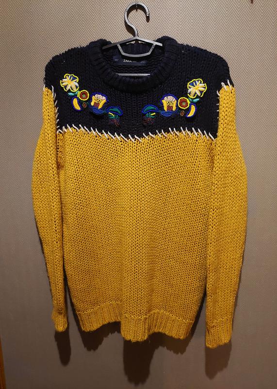 гарний светрик з вишивкою з бісеру розмір по бірці с, але буде добре і на м і на л, заміри:Плечі 43 смРукави 58 смДовжина 63 смПід руками і по низу 57 смсклад на фото