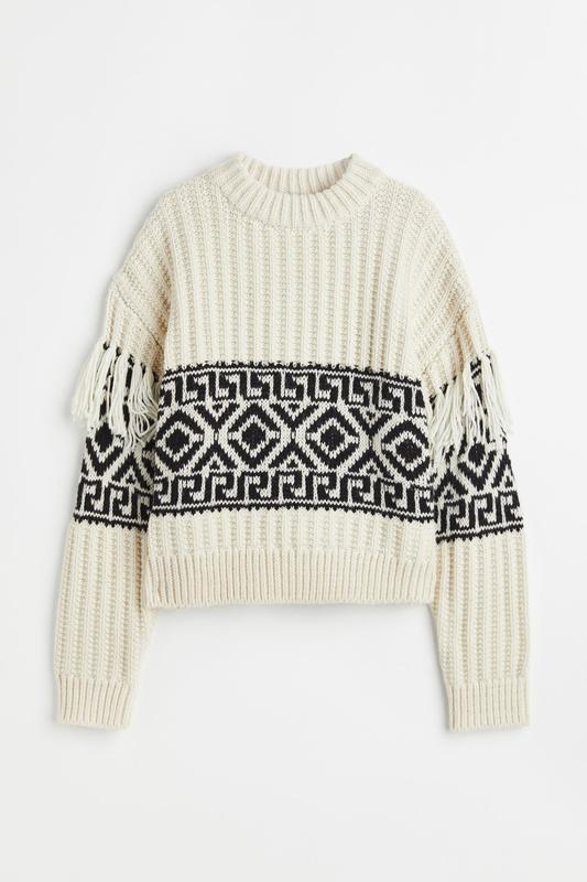 H&m Светр жакардової в'язки з додаванням вовни. Вільний крій із круглим вирізом горловини, заниженою лінією плечей та довгими рукавами з бахромою на плечових швах. Ребристі манжети та поділ