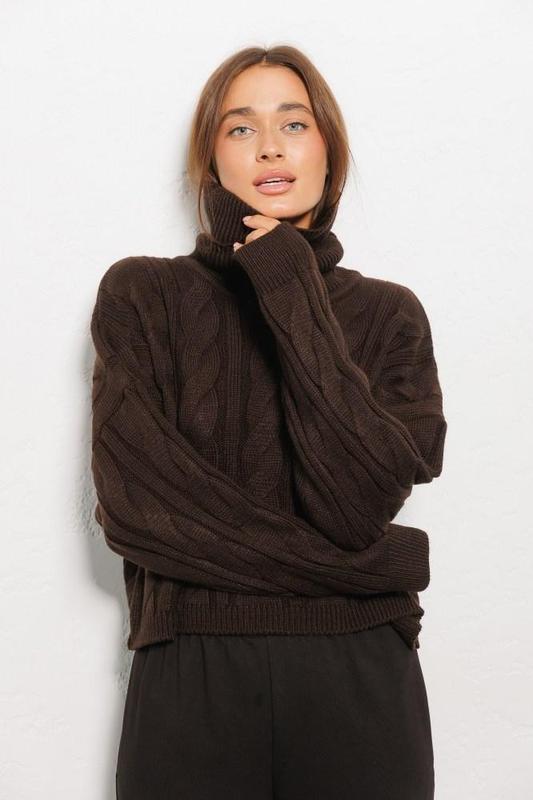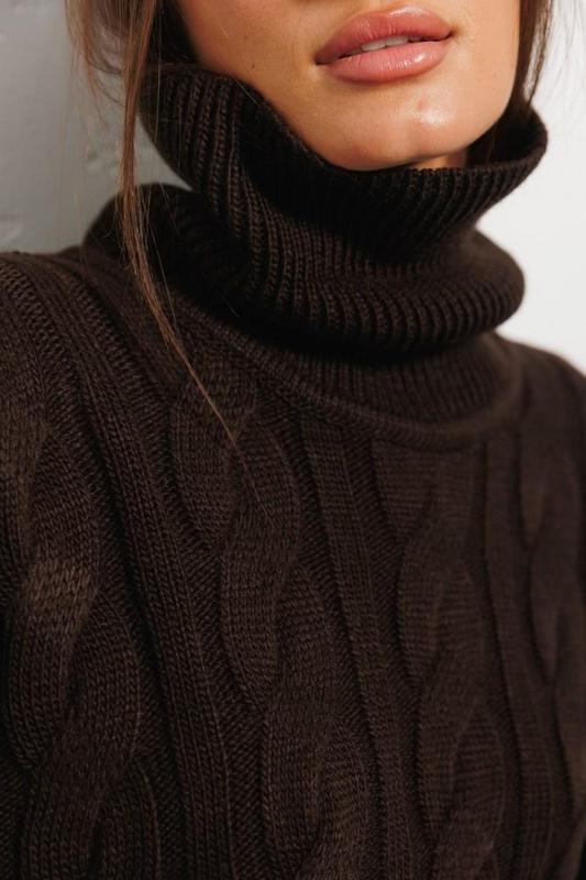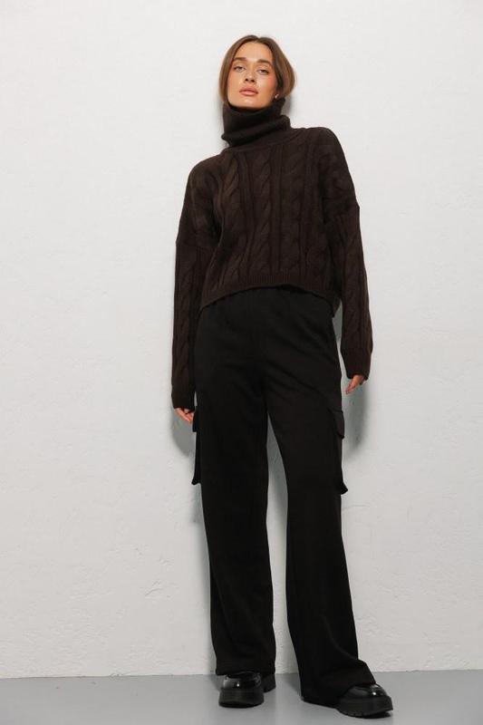 Темно-шоколадний в'язаний жіночий светр із великими косами -- це стильне та