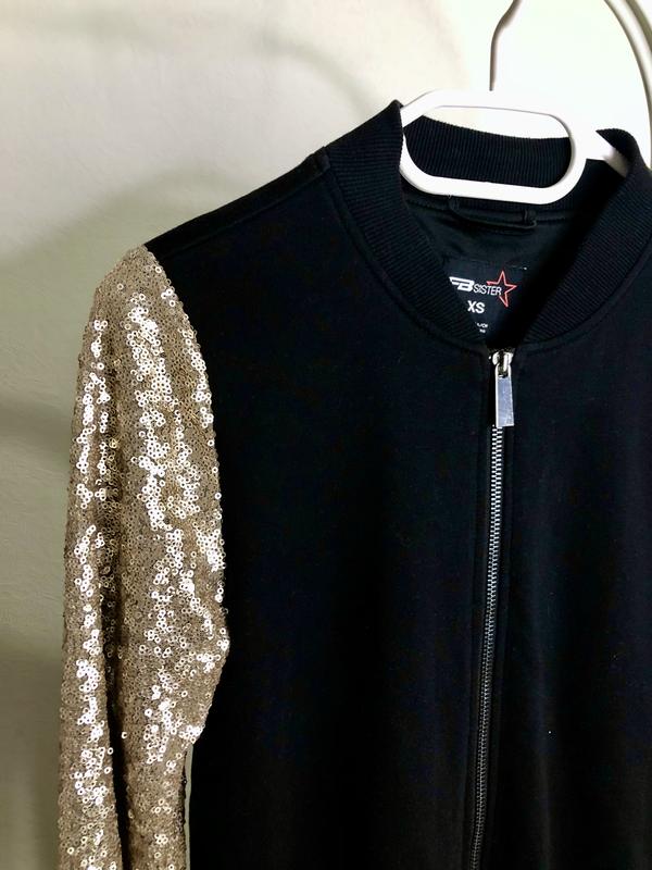 Чорний бомбер, в ідеальному стані, на рукавах світло золоті паєтки. Дуже гарно і стильно виглядає