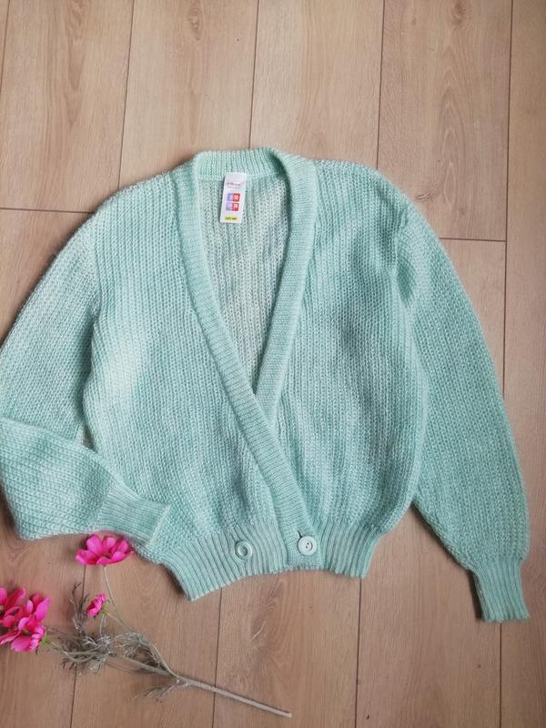 кардиган мятного цвета. Размер указан 8-10 /S M. Ориентируйтесь на замеры. Длина кардигана 60 см. Полуобхват груди 52 см. Полуобхват низа (резинки) 36 см. Длина рукава от горловины 74 см. Состав 50%мохер 50%акрил. Состояние идеальное. Следов носки нет. Фото на теле нет.