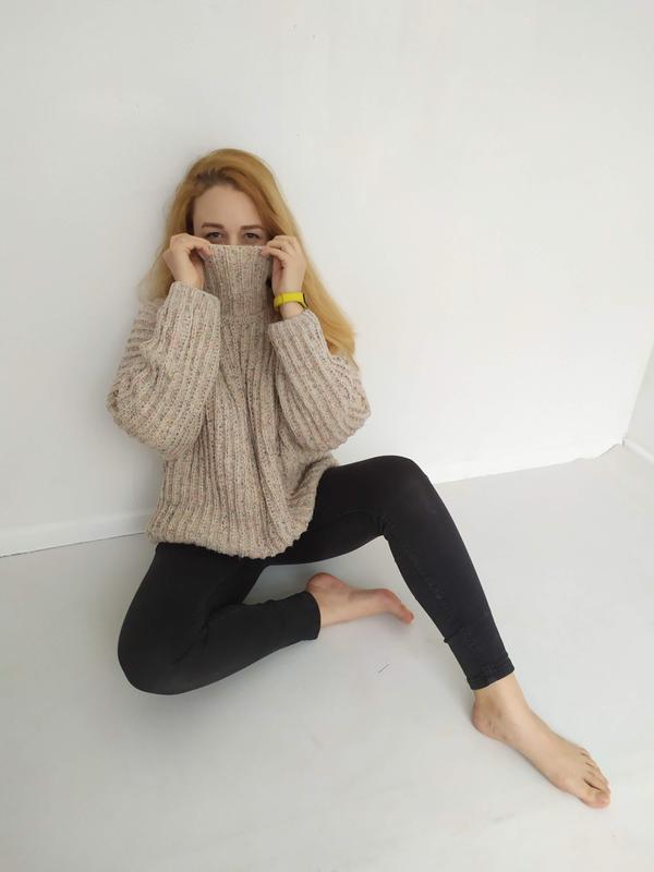Жіночий светр оверсайз звʼязаний з натуральної вовни та бавовни. Комфортний для зимових прогулянок, заміських поїздок чи домашнього відпочинку. На розмір М. Висота 59,5 см Ширина 60 см Рукав у місці пришиву 37 см Висота горловини 18 см Лише ручне прання при температурі 30 градусів у рідкому порошку для вʼязаних виробів.
