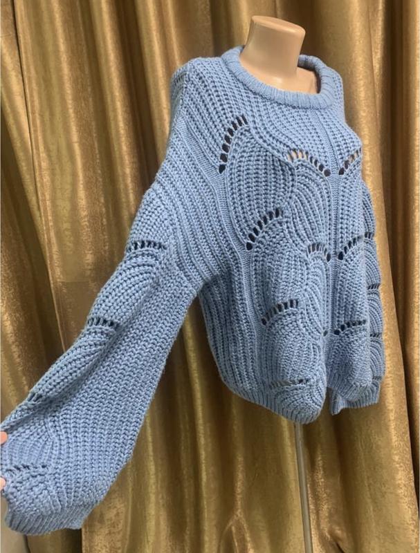Трендовий теплий в'язаний синій светр gina tricot оверсайз реглан з пишними рукавами Розмір xl/2xl Велика в'язка Плечо приспущене Колір блакитний Довжина 65/67см Довжина рукава від горловини 83см. Напівобхват грудей 64-79см Напівобхват талії 61-795см Напівобхват стегон 62-75см Чудово тягнеться Склад: 85% акрил, 15% поліамід, м'який, приємний на дотик