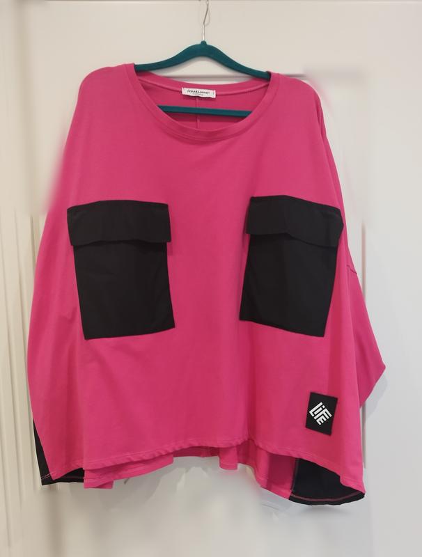Свитер. Лонгслив.Модный.Италия.ACQWA s LIMONE.Оверсайз ,на любой размер.На любую фигуру.На брюки,лосины,юбку.Цвет фуксия,впереди 2 накладных кармана из плащевки черного цвета,вставки по бокам из этой же плащевки.Спущенный рукав,рука пройдет любаяСпинка чуть длиннее .Состав супер, на бирке( фото).Без нюансов и запахов.Свой шкаф!.одевался 1 раз. длина перед 70,спинка 75 см рукав до 80 см Ог и об свободно,покрой как пончо до 175-180.Оверсайз. вышлю после оплаты.Читайте отзывы))).