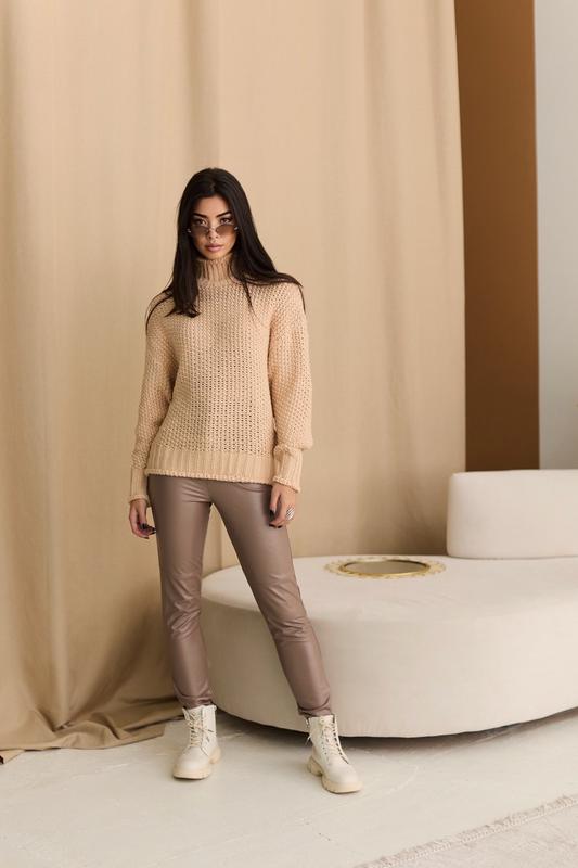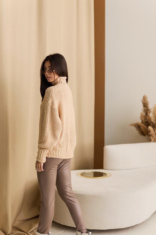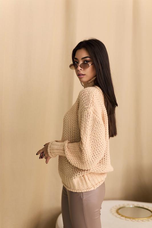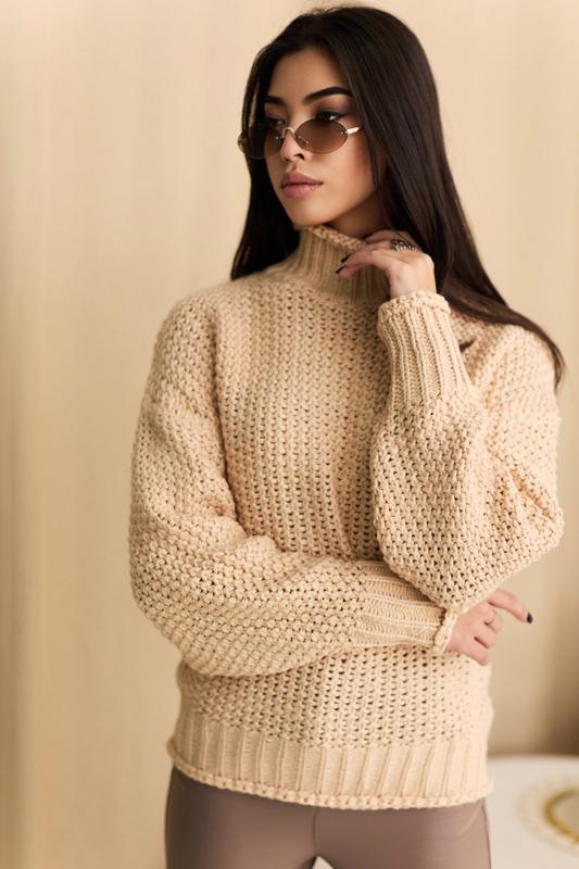 Теплый вязаный свитер выполнен из мягкой пряжи высококачественной вязки. Фасон "летучая мышь". Свободный крой. Высокая горловина в виде резинки. Длинные рукава с манжетами. С воротником стойка и спущенным плечом.