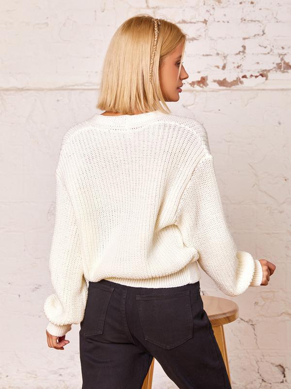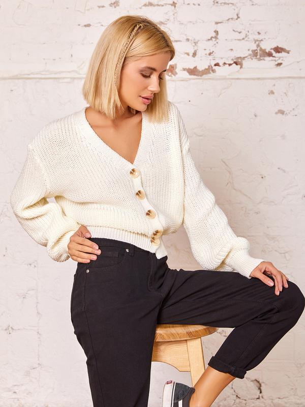 Молочно-білий светр-кардиган на ґудзиках з V-подібним декольте. Модель з манжетами і довгими рукавами володіє вільним кроєм. Светр виконаний з однотонної вовни об'єднання ємної у язки. Бренд: Magnet Розмір: S Матеріал: Вовна Склад: 30%, вовна, 70%, акрил