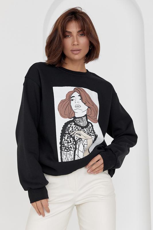Теплий жіночий світшот з принтом дівчини — чорний колір, s (є розміри) l