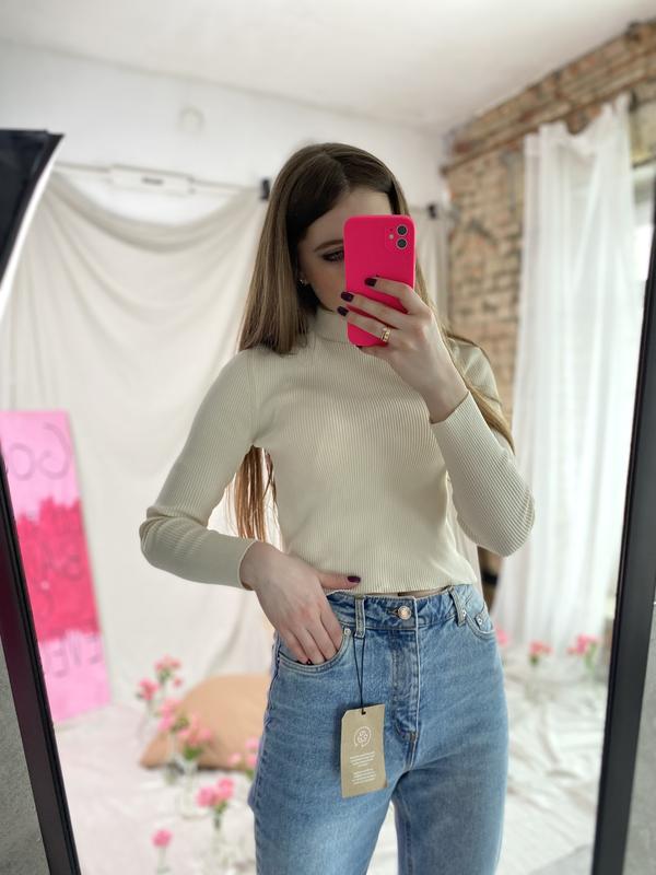 Бежевий базовий гольф. Розмір по бірці М, але буде на Xs-S-M. Гарно тягнеться та не обтягує.
