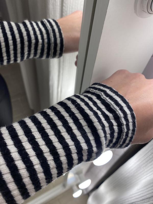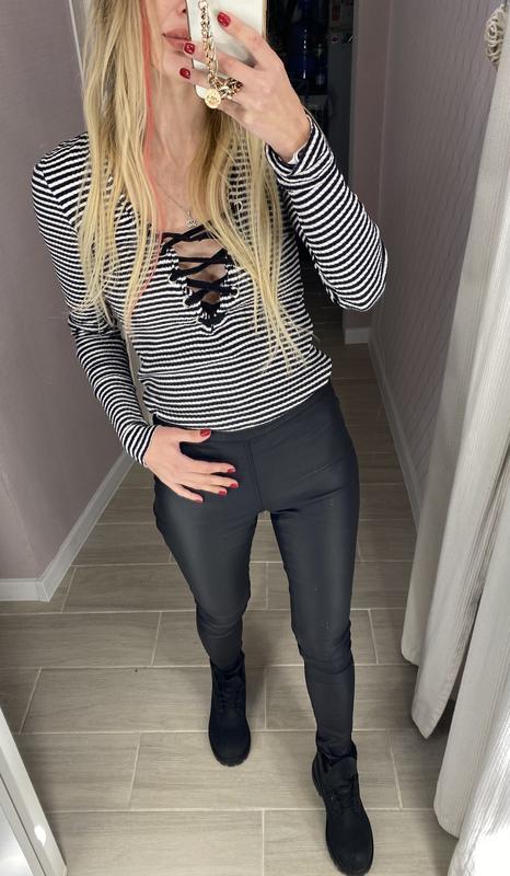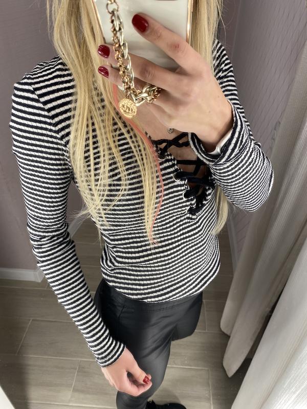 Гарна та стильна водолазка в смужку, має гарне декольте на зав’язках. Розмір С, стан відмінний.