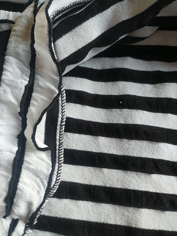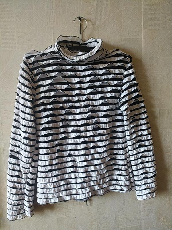 Гольф дуже яскравий, нестандартний, неординарний в рюшах в чорно-білу смужку, стрейч, об'єм по грудям 76-96, довжина по центру спинки від горловини до низу 53, рукава 54