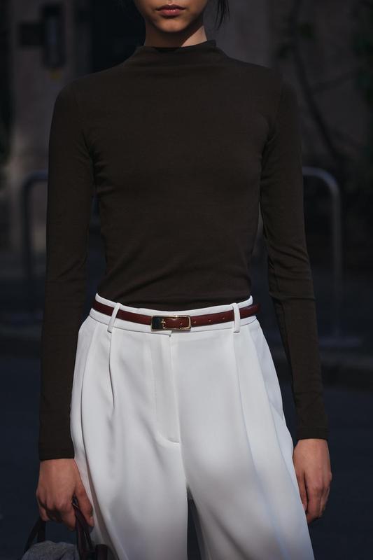 Футболка зі змішаної штапельної тканини з бавовною. Високий комір-хомут і довгі рукава.