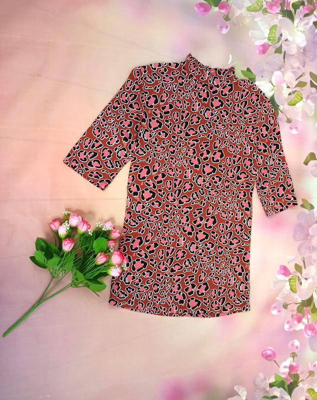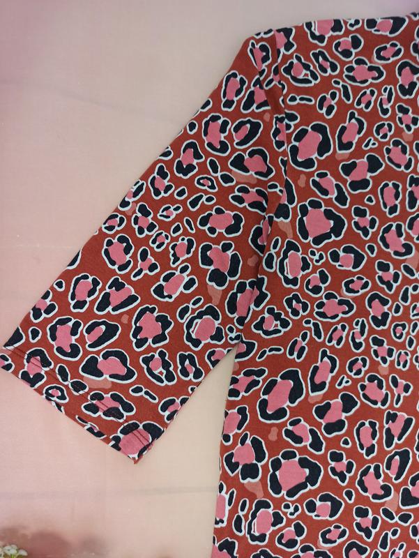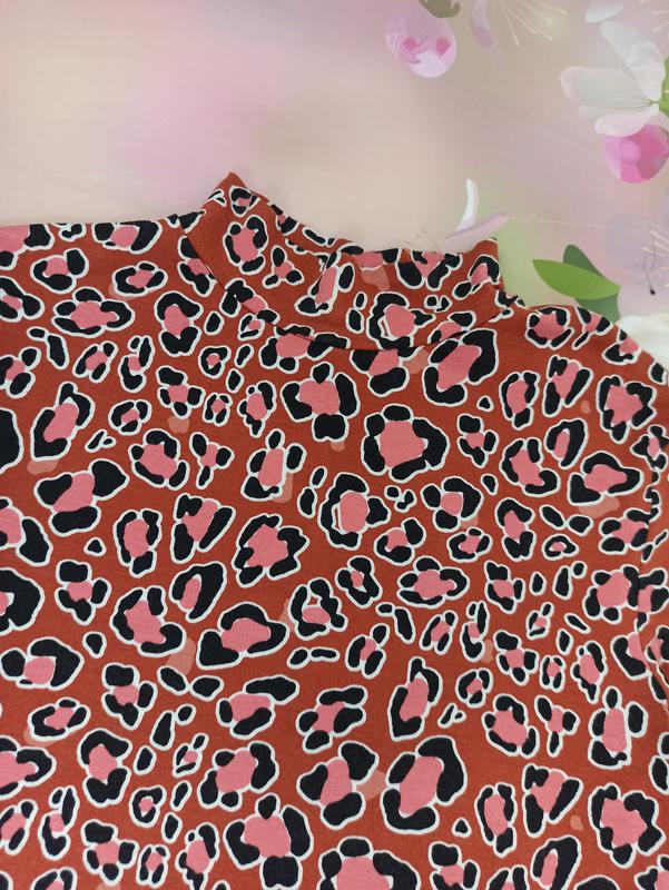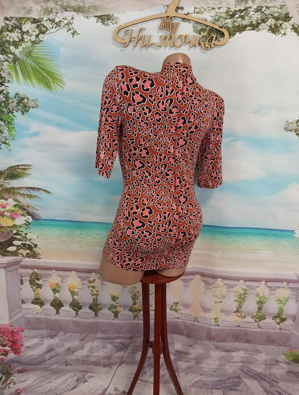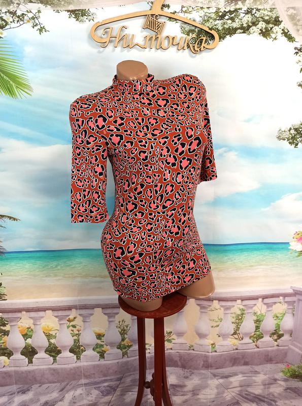 Пропоную щільну футболку - гольф Приталений подовжений силует, короткий рукав , комір -стійка М'який, приємний, еластичний! Колір - коричневий, теракотовий стилізований леопардовий принт Розмір приблизно 42-44 наш, вказаний S, Фірма HEMA Довжина -63, напівобхват грудей -40-50см, довжина рукава -31см. Тканина - щільний еластичний трикотаж, дуже приємний до тіла,віскоза-95%,еластан-5% Стан - відмінний