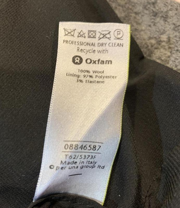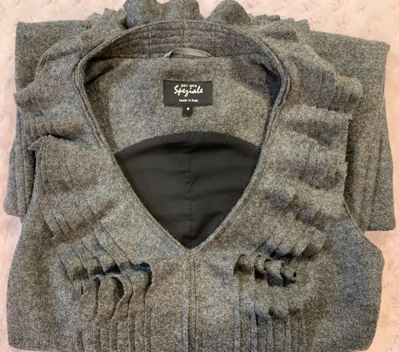 Склад матеріалу 100 % вовна. Підкладка 97% поліестер 3% еластан. Тканина з натуральної вовни — це ідеальна тканина пальтова. Тканина середньої щільності, м'яка на дотик. Річ має сліди носіння.