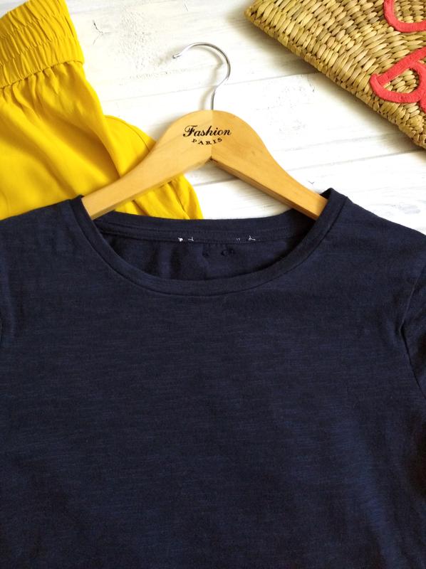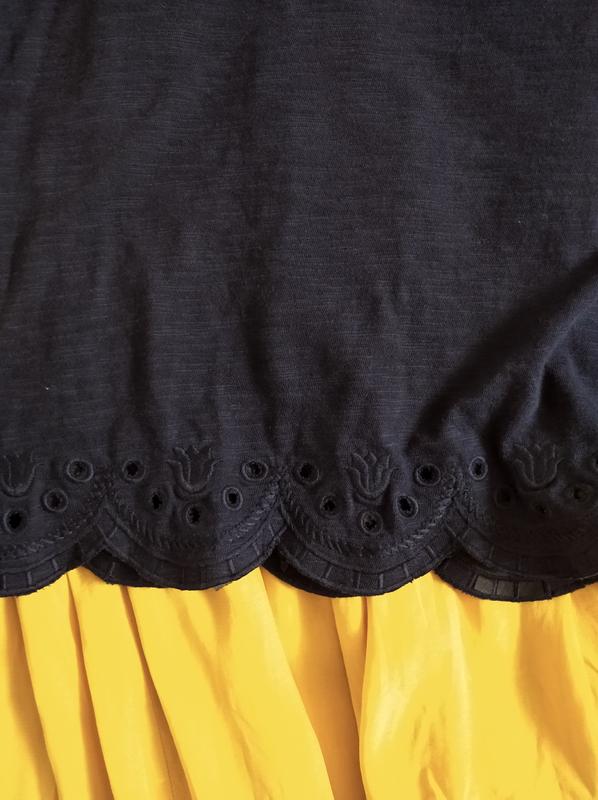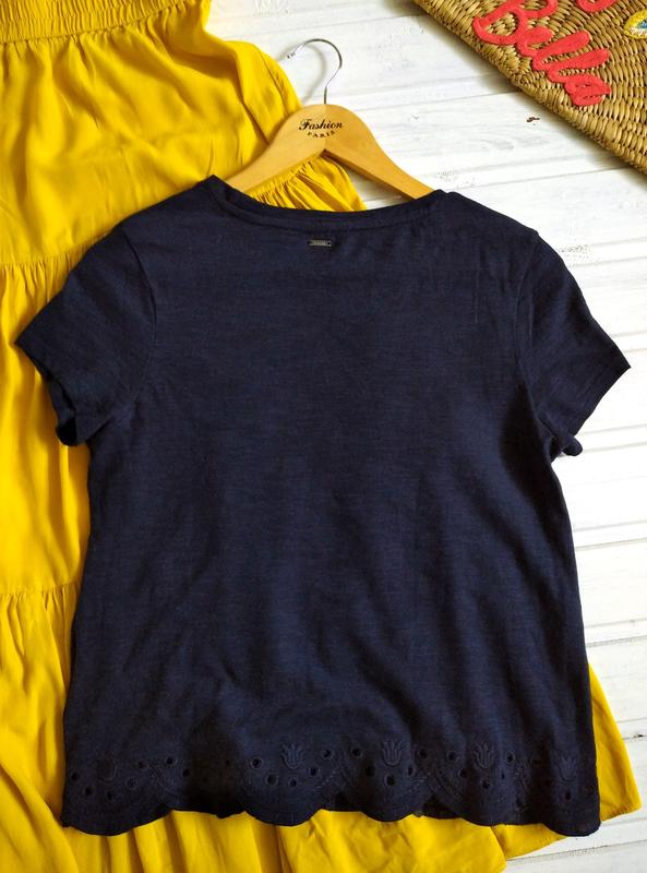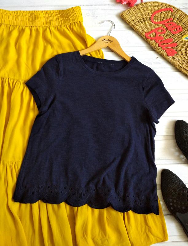 Бавовняна футболка з фігурним низом та вишивкою в тон. ПОГ 46.5 ПІТ 48 Низ 54.5 Довжина 56 Плечі 37 Рукав 15 Склад: 100% бавовна