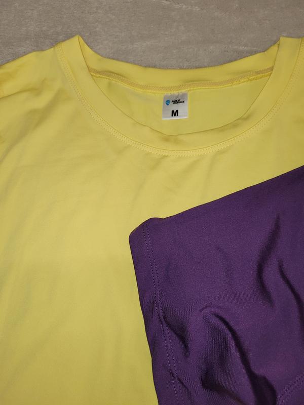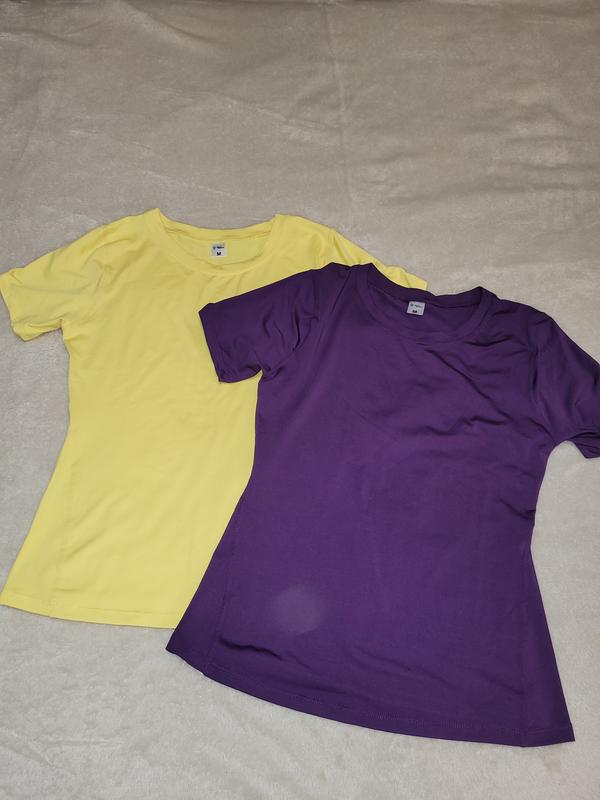 Лаконичные, качественные футболки для спорта и отдыха, красивые яркие цвета- желтый и фиолетовый, приятный эластичный трикотаж средней плотности.Новые, но без бирок.