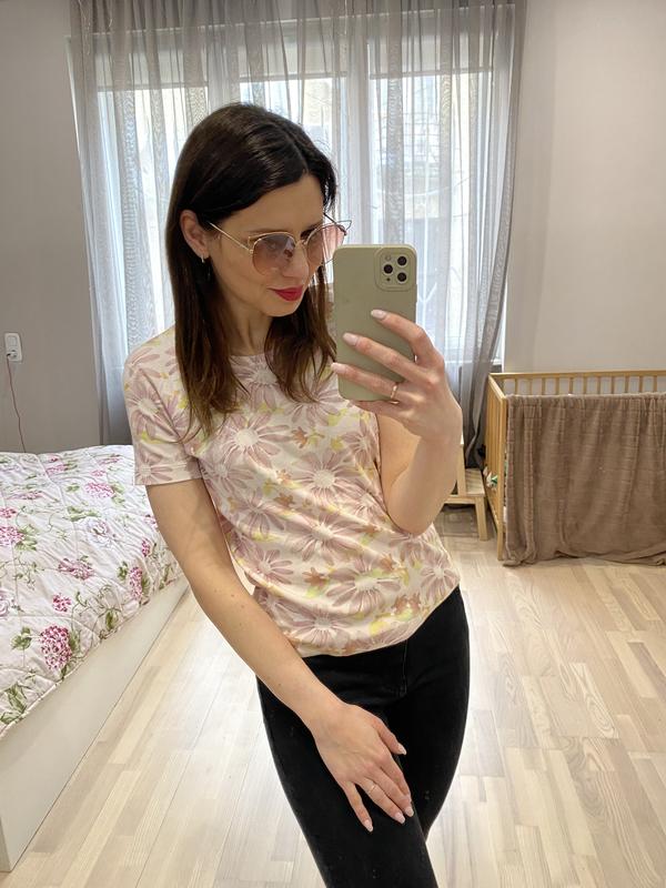 Гарна футболочка від Marc Cain. Оригінал. Якість чудова. Красивий ніжний квітковий принт. Футболка дуже тянеться. На жаль,бірочка зі складом відрізана. Але ,впевнена,що це натуральна. Думаю,коттон. Розмір по замірам відповідає 38(бірки немає). Заміри : довжина 57см,плечі 38см,ПОг 46см,Пот 45см. Дуже тянеться