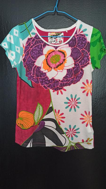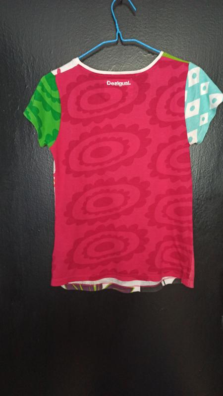 Футболка женская или на подростка 13-14 лет испанского бренда desigual яркая летняя лёгкая очень яркий принт. Размер 8 Длина 60 см, ширина 42 см