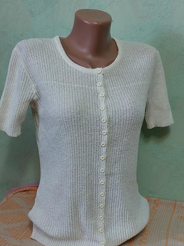 легка кофта з коротким рукавом, футболка а ідеальному стані, довжина по спинці 56 см, ПОГ 44 см, ширина плечей 41 см тканина тягнеться добре бирки зі складом і розміром немає ґудзики тільки перші 3 розстібаються