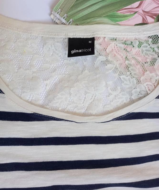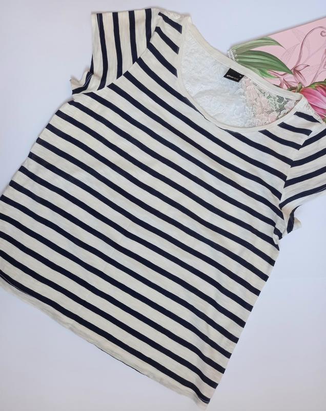 Красивая женская футболка шведского бренда Ginatricot , тоненькая , перед синяя с белым полоска , спина - кружево со стретчем.