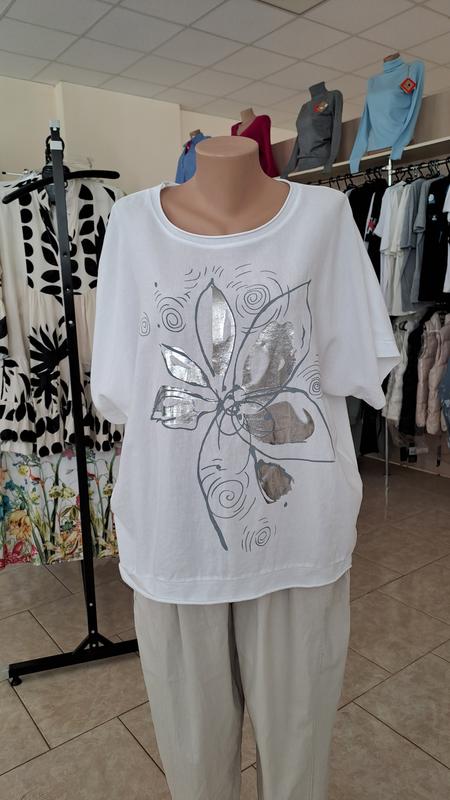 в наявності футболка білого кольору з принтом квітка.Якість дуже гарна Легенька. довжина 67 по переду.По спинці 74 см. ПОГ 70 см.Спинка тягнеться трохи.Спереду котон.Виробник Італія