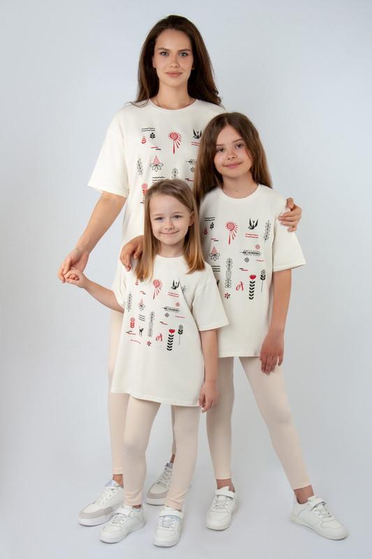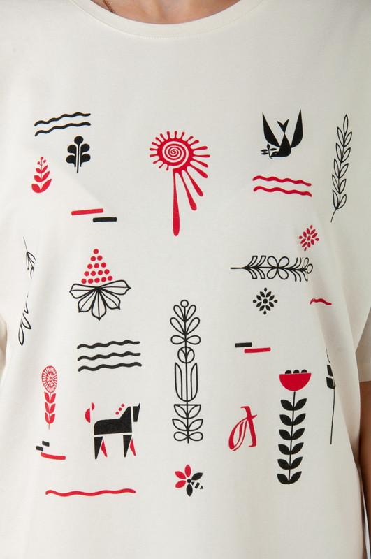 Стильна футболка oversize для жінок із легкого стрейч-куліра. Модель з короткими рукавами та округлим вирізом, пропонується в різних кольорах з актуальним цього сезону принтом, виконаним методом шовкотрафаретного друку. Футболка відмінно комбінується з джинсами, шортами, легінсами. Полотно хорошої якості, не линяє, натуральне за складом.