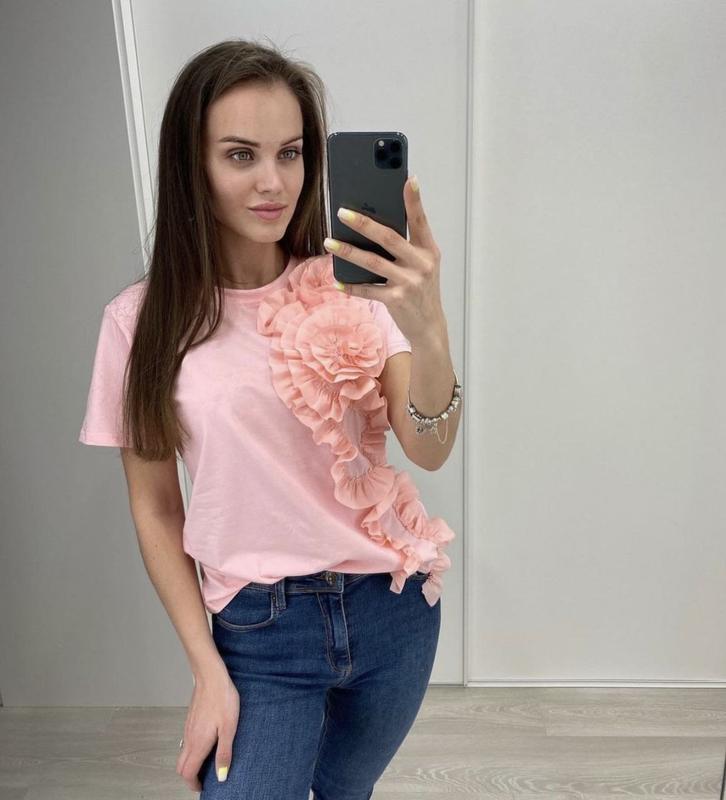 Базова футболка oversize, з воланами і бантиками з фатину. Універсальний варіант як для повсякденних, так і вихідних образів.