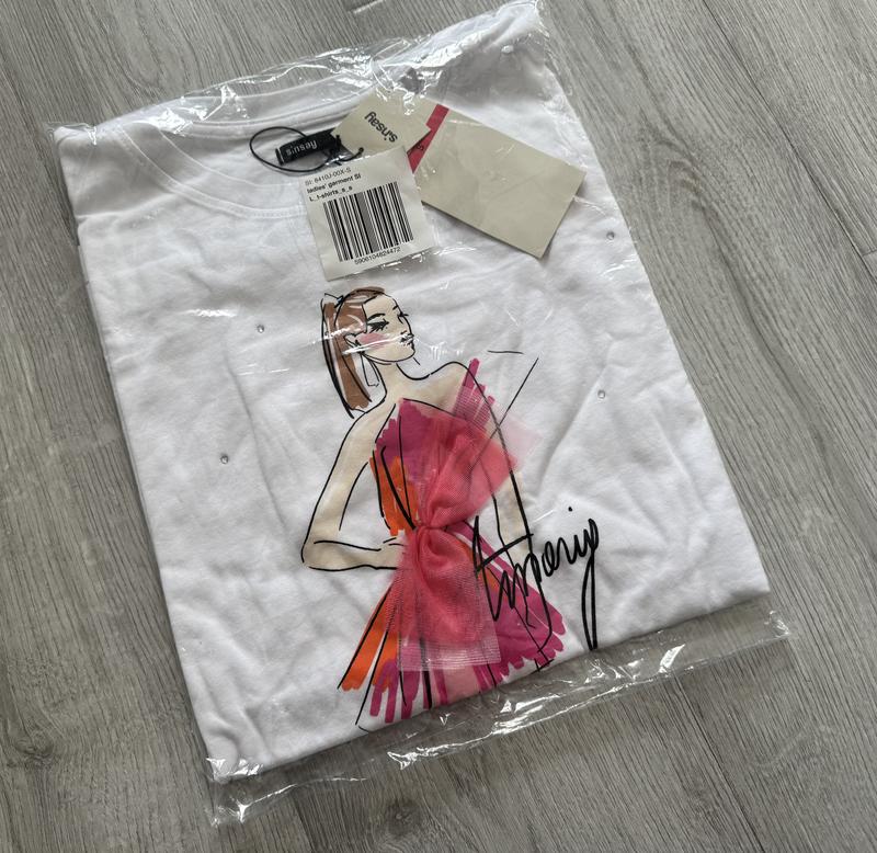 Футболка жіноча Розмір SДовжина збоку 59 смРукав від плеча 15,5 см Плечі напівобхват 47 смГруди напівобхват 53 смЗаді трохи довша на 3 см Доставка УП, нова