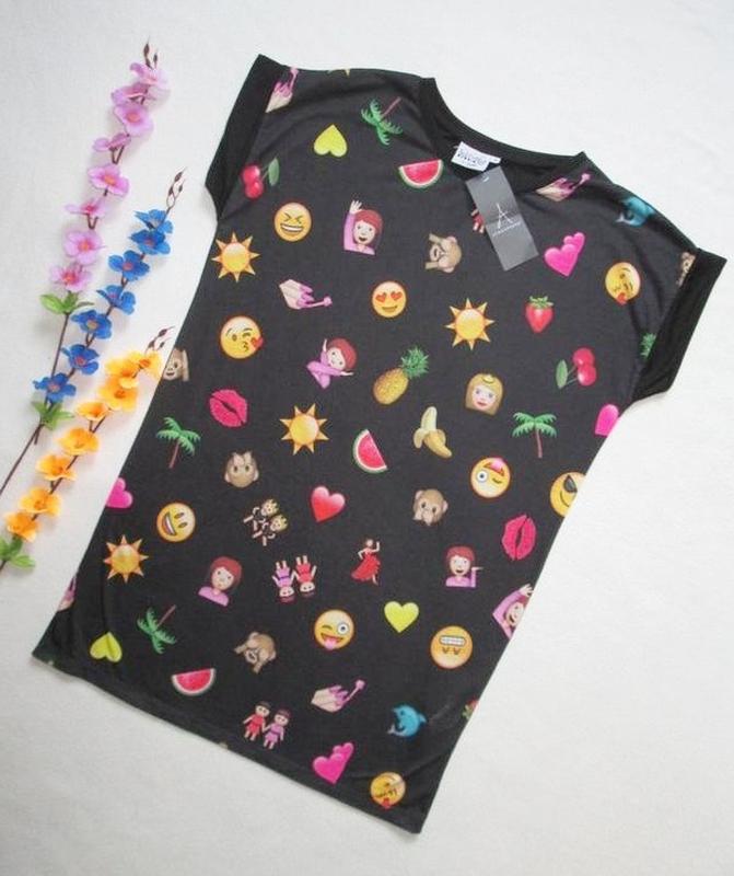 Класна подовжена легка футболка принт смайлики Atmosphere. 👕 Нова. Розмір 6 (можна на 8). 👕 Не щільна, легка. 👕 Орієнтуйтеся на заміри. Довжина від плеча 77 див. Плечі будь-які. Напівобхват грудей 51 див. Напівобхват талії 48 див. Напівобхват по низу 49 див. Тягнеться. ОБМІНУ та ПОВЕРНЕННЯ НЕМАЄ! ФОТО на ТІЛІ НЕ РОБЛЮ! ВАЖЛИВО! Перед покупкою прошу ознайомтеся з умовами у розділі "про мене" https://shafa.ua/member/svikkka/about Речі second категорія LUX!