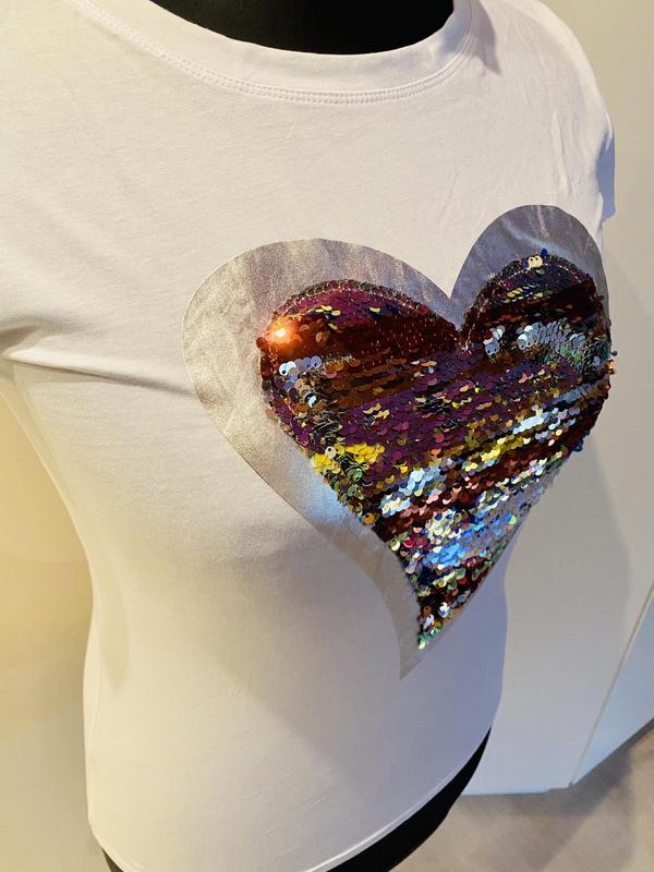 Футболка Amelie Folies Італія, розмір L , XL , ціна 585 грн Комфортна і стильна Футболка Amelie Folies, ТМ Італія Відмінна якість, тканина м'яка і приємна, відмінно тягнеться Спереду серце з різнокольорових паєток - перевертнів. СКЛАД - бавовна 95%+еластан 5 %. ПОГ 49-52 см, довжина 63 см, довжина рукава 12 див. В комплекті - сьемная брошка у вигляді квітки з шифону. Футболочкой буде однозначно задоволені!
