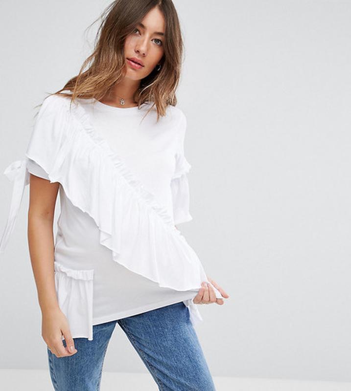 Футболка бавовняна з рюшами і бантиками ASOS Maternity -Футболка з рюшами і бантиками ASOS Maternity "Топ для вагітних ASOS Maternity, Бавовняний трикотаж, Круглий виріз, Багатоярусні рюші, Банти на манжетах, Класичний крій, точне відповідність розміру, Підходить для будь-якого терміну вагітності, Машинне прання, 100% бавовна, Розмір моделі: UK 8/EU 36/US 4, зріст моделі: 169 см. Одяг для вагітних переходить на якісно новий статусний рівень завдяки моделям з колекції ASOS Maternity. Разработанные лондонскими дизайнерами модели подойдут беременным от срока три месяца и далее - гардероб будущей мамы (британские размеры 6-20) будет "расти" вместе с вашим животиком благодаря регулируемым застежкам и эластичным вставкам на талии. Запаситесь всем необходимым на время беременности и первые месяцы после родов, выбрав наши базовые модели из трикотажа, бюстгальтеры для кормящих мам, платья, деним и верхнюю одежду, которые были созданы специально для этого особого периода вашей жизни." Замеры: длина 65 см, пог 47 см.