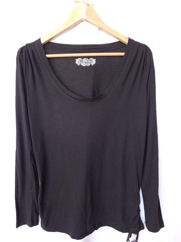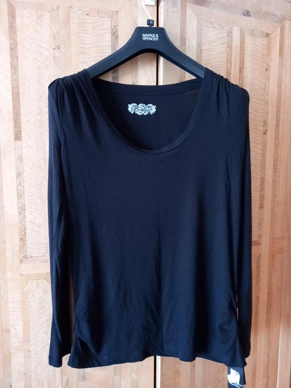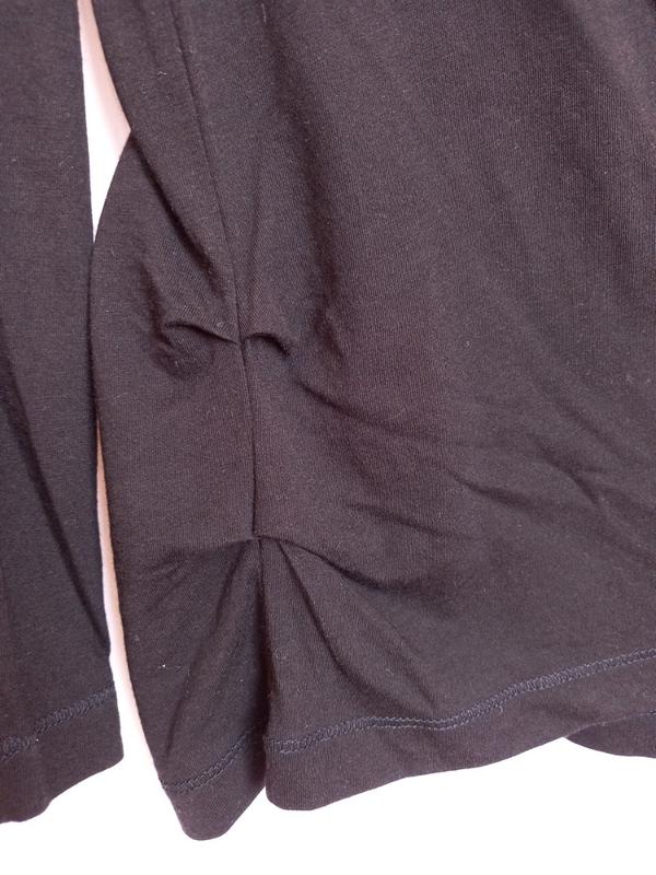 тонка, легка з декольте та довгий рукав ширина грудей 50см ширина талії 44см ширина внизу 51см довжина виробу 70см довжина приблизно від талії до низу 33см, довжина рукава 72см верх рукава прикрашений 6 складками низ прикрашений 4 складками по обох боках кофта насичений чорний