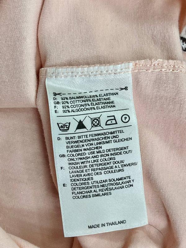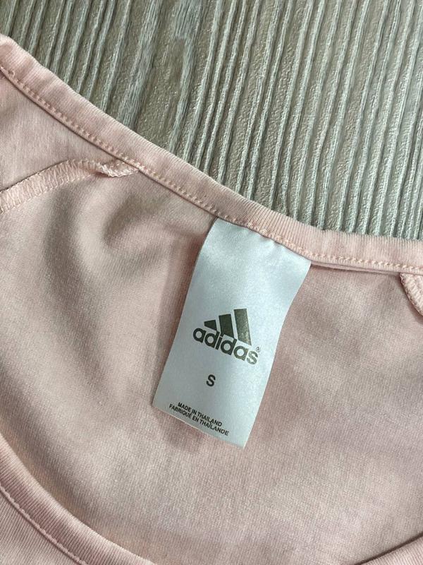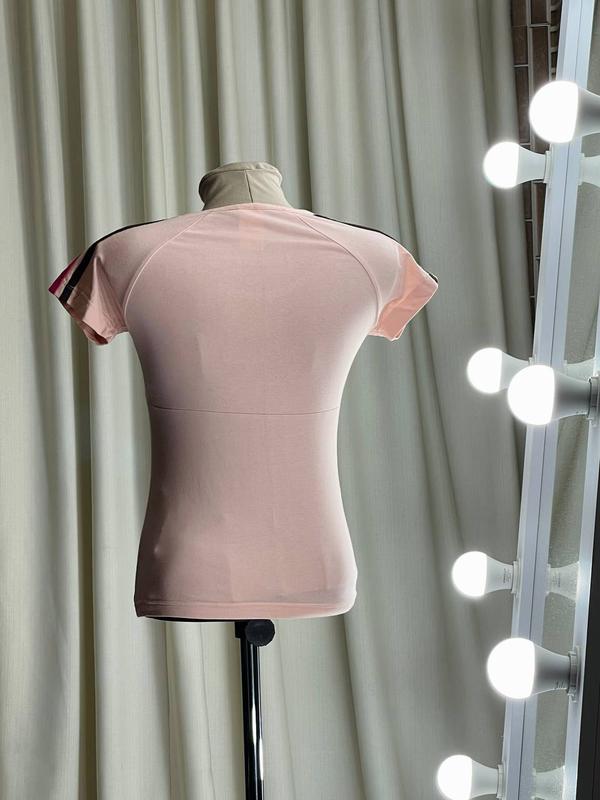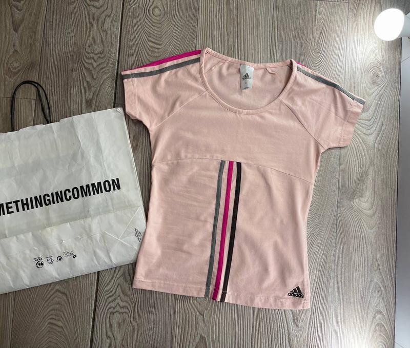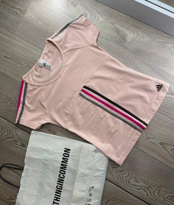 Футболка пудрово-рожевого кольору з кольоровими смужками ТМ ADIDAS🛍💕😏😍😍😍 Розмір - UK 8/EUR 36/ S / 42-44 ( російська). Склад: 92% бавовна, 8% еластан. Виробництво Таїланд . Футболка з відрізним верхи і кольоровими смужками переду . Рукав-реглан короткий з кольоровими смужками . Логотип бренду вишитий внизу ( коричневого кольору) . Досить глибокий виріз горловини переду . Середня довжина .